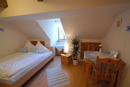 Im Obergeschoss und Rückgebäude befinden sich 11 Doppel- und Einzelzimmer. Hell und freundlich im Landhaus-Stil eingerichtet. Alle Zimmer sind mit Küchennischen, SAT-TV, Radio und WLAN ausgestattet. Im Festzimmer gibt’s jeden Tag ein reichhaltiges Frühstücksbuffet. Auf Anfrage auch mit Weißwürste bis maximal 12 Uhr. Für größere Familien bietet sich an, zwei oder drei direkt nebeneinander liegende Zimmer zu belegen. Wohlerzogene und saubere Hunde sind willkommen und ihre Beherbergung ist kostenlos.